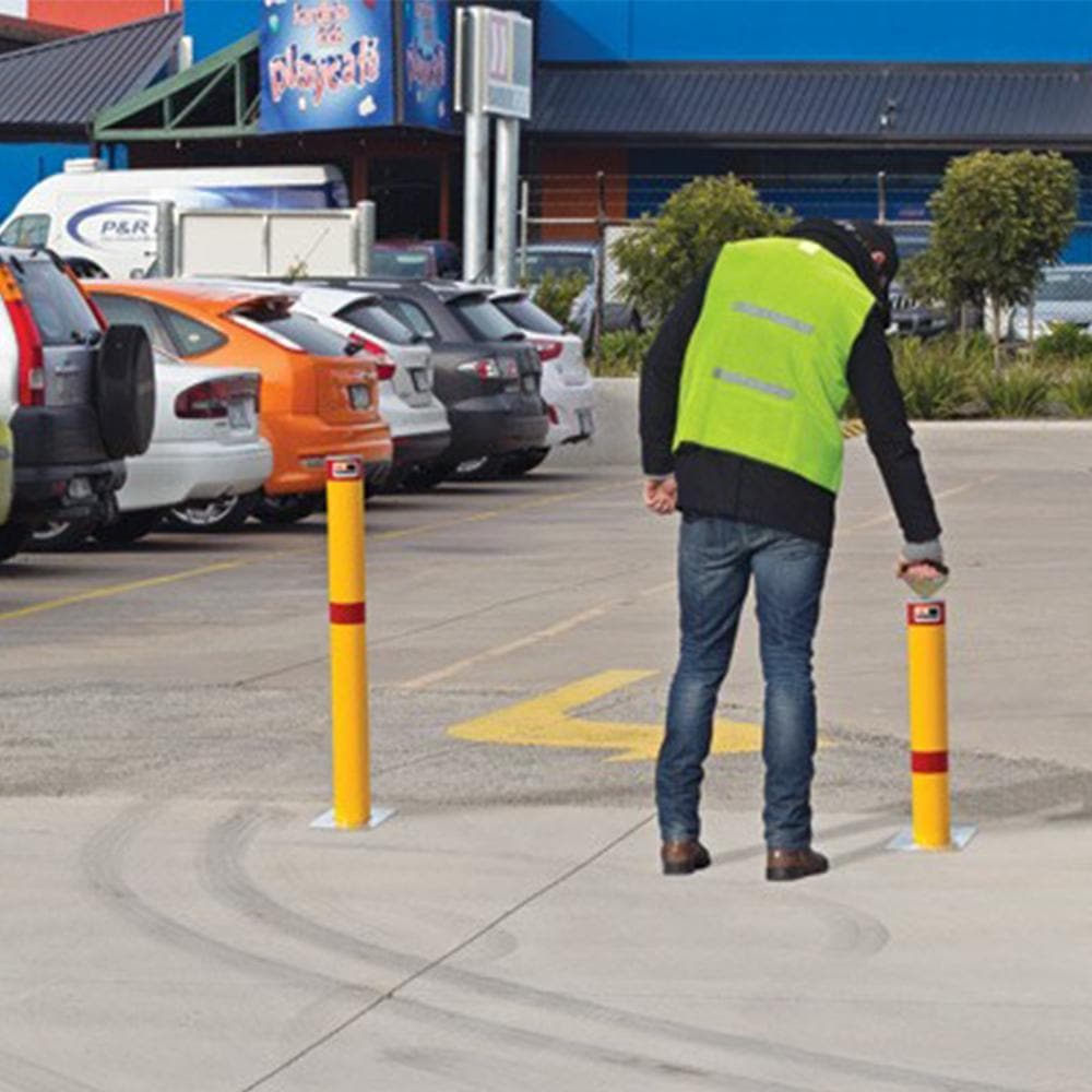Galvanised in ground casing keeps the bollard safe and can’t be tampered. For extended as well as retracted positions, the round 900mm diameter bollard gets locked in its position. Hence no safety issues will arise. This model has a black anti-slip top surface and two reflective bands on its powder coated model for notifying vehicles/ drivers regarding the bollard placed on the ground under low light conditions.