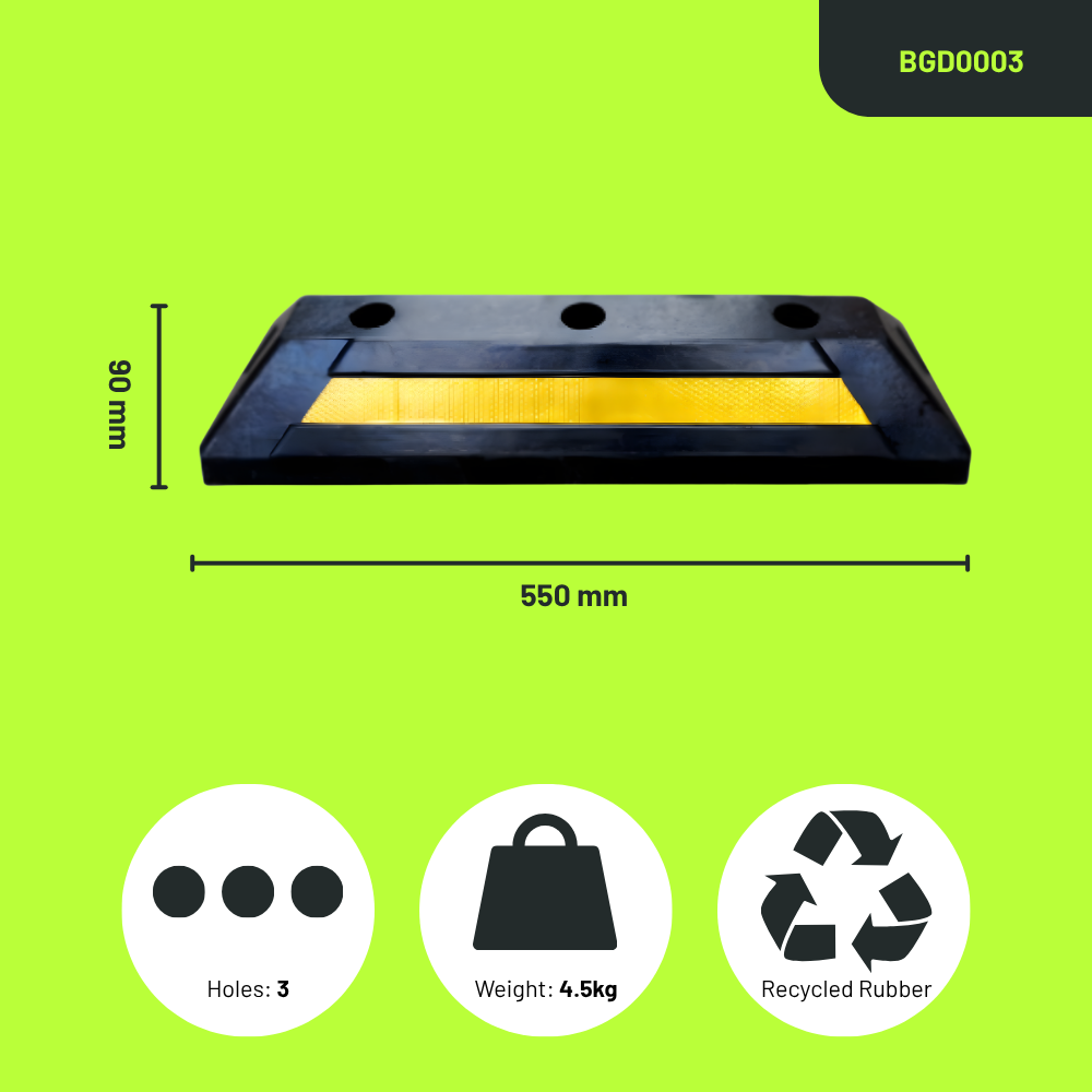Made from recycled rubber and weighing around 4.4–4.5kg, it is easy to handle while still holding up under regular vehicle contact. The compact size makes it suitable for tighter layouts or setups where multiple stops are used across a single bay.