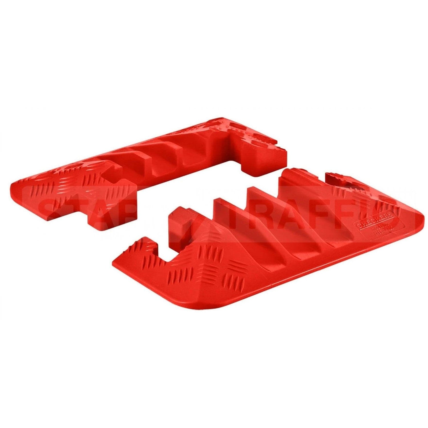 Employ a pair of Checkers 3 Channel End Cap Cable Protector for a smooth transition to the ground when attached to the end of cable protectors. They protect electrical cables, cords and hose lines from damage by vehicle and pedestrian traffic while providing a safe crossing. The 5 roomy channels securely house cables to ensure safety. Caps' 5-bar tread design offers maximum traction to feet and wheels. The modular interlocking design makes these caps perfect for use in industrial, commercial, and utility applications.
