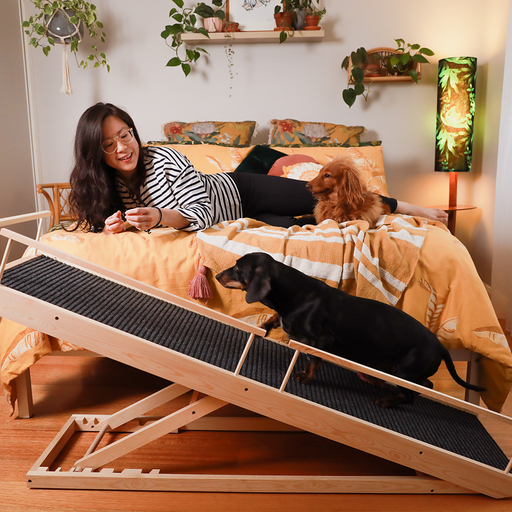 The Heeve 'Up-Ya-Get' Wooden Dog Ramp is the #1 Australian-designed dog ramp for small to medium-sized dog breeds allowing your pooch safe and easy access on and off beds and couches.